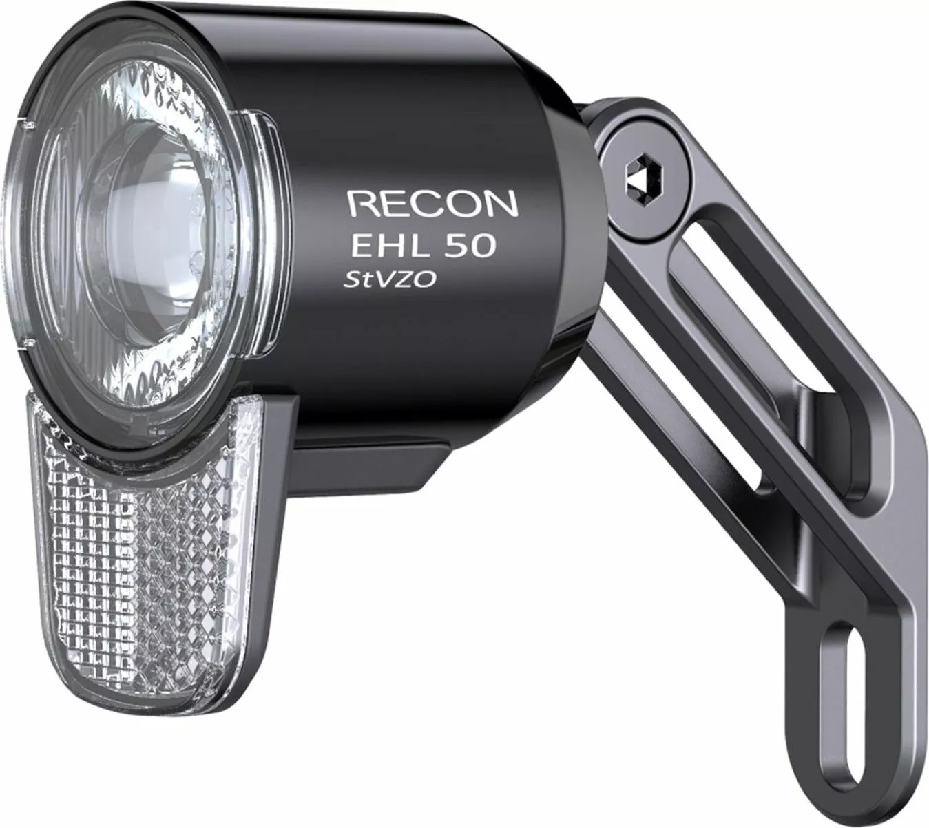 Phare vélo Giant Recon E HL 50. Lampe compacte et légère offrant un éclairage large et lumineux. D’une puissance de 150 Lumen (50 Lux), l’éclairage vélo Recon E HL 50 est compatible avec les vélos électriques Giant équipés d’un moteur Yamaha (câble inclus) et avec les moteurs Shimano & Bosch (câble vendu séparément).