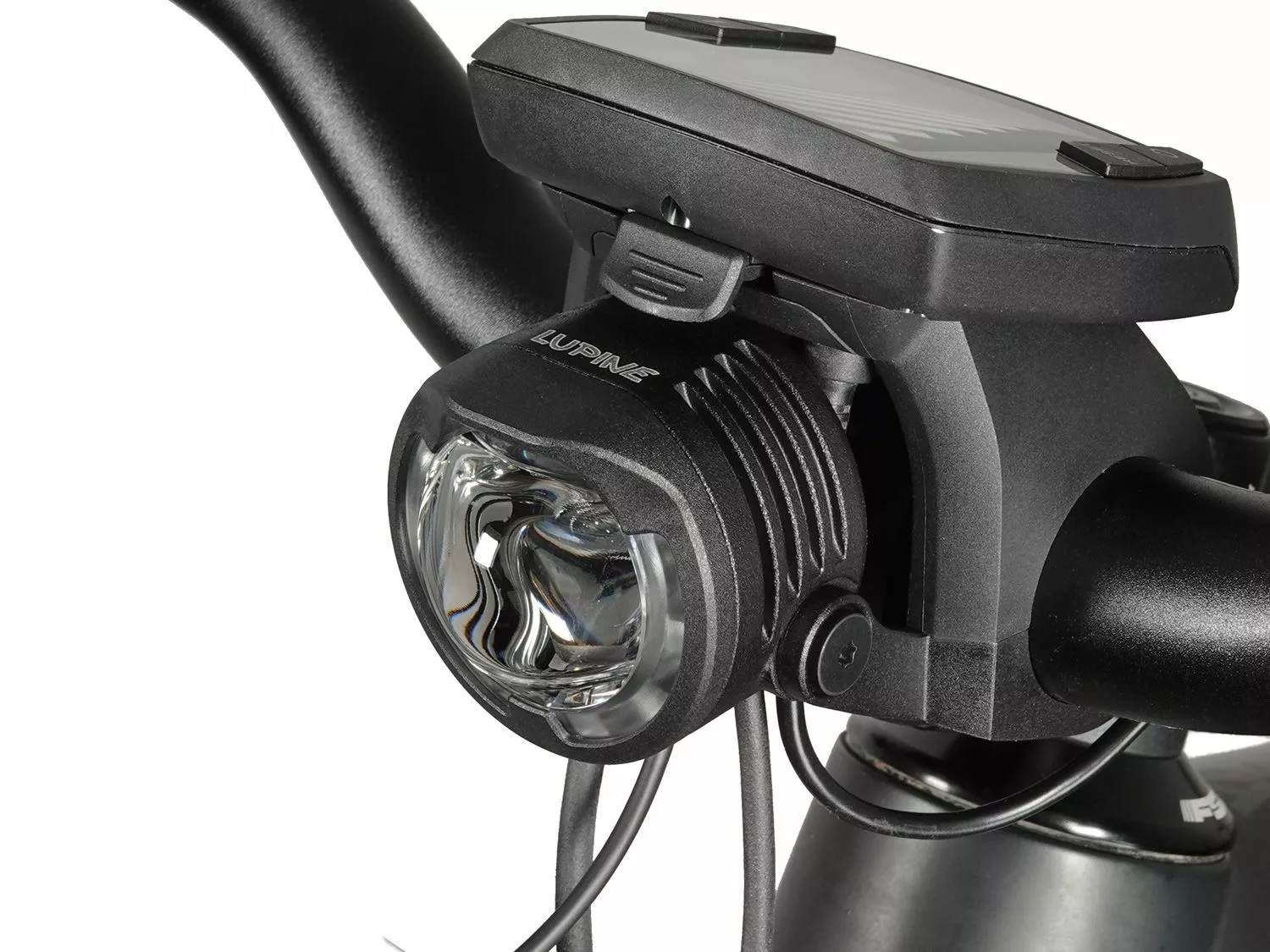 L’éclairage avant Lupine SL F a été conçu pour les vélos électriques équipés d’un écran de contrôle Bosch Intuvia ou Nyon Gen.2 (dès 2020). Il vous permettra de vous déplacer en toute sécurité, de jour comme de nuit. Il embarque un feu diurne commandé par capteur, un feu de croisement de 900 lumens qui n’éblouit pas et un feu de route de 1300 lumens qui s’active confortablement grâce à une manette au guidon et assure un éclairage optimal la nuit sur route.