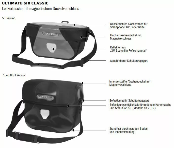 La sacoche de guidon Ortlieb Ultimate Six Classic 5L, fabriquée en toile polyester étanche, est à avoir dans votre équipement vélo si vous aimez la randonnée. Sur le dessus de cette sacoche, vous trouvez compartiment pratique : transparent et étanche il permet de ranger un smartphone, un GPS ou une carte. A travers le film transparent vos appareils tactiles resteront tout à fait fonctionnels.