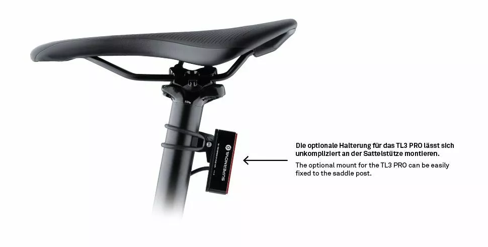 Avec le TL3 PRO, Supernova présente son premier feu arrière avec feu stop et signal de freinage d’urgence. Le feu stop est commandé par un capteur à 3 axes de haute précision, ce qui signifie qu’il se passe de levier de frein.