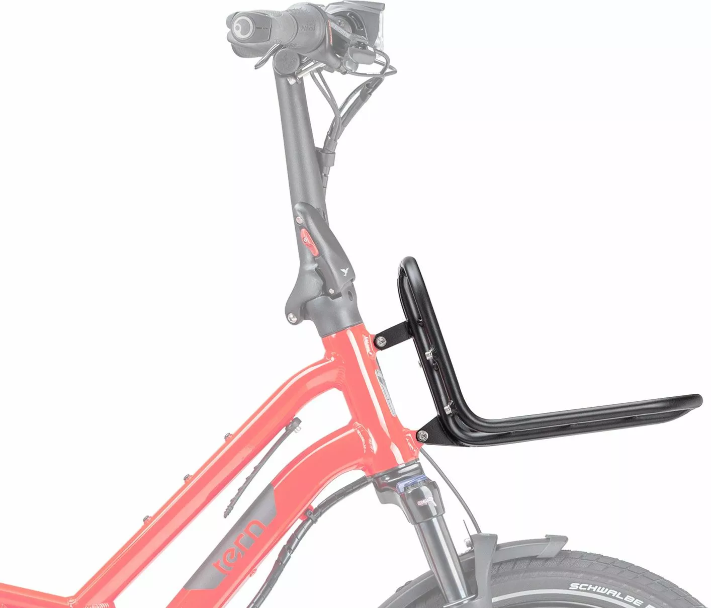 Le porte-bagages avant Tern Hauler Rack se fixe sur le tube de direction de votre vélo électrique Tern GSD ou HDS grâce à 2 vis.