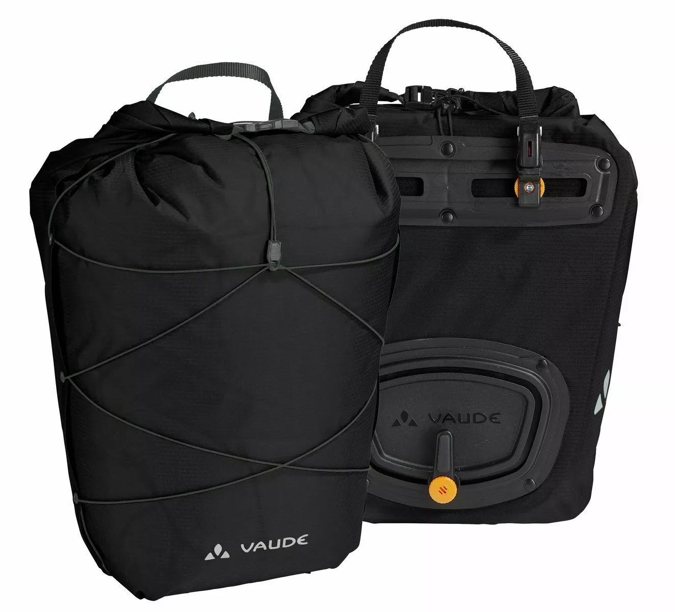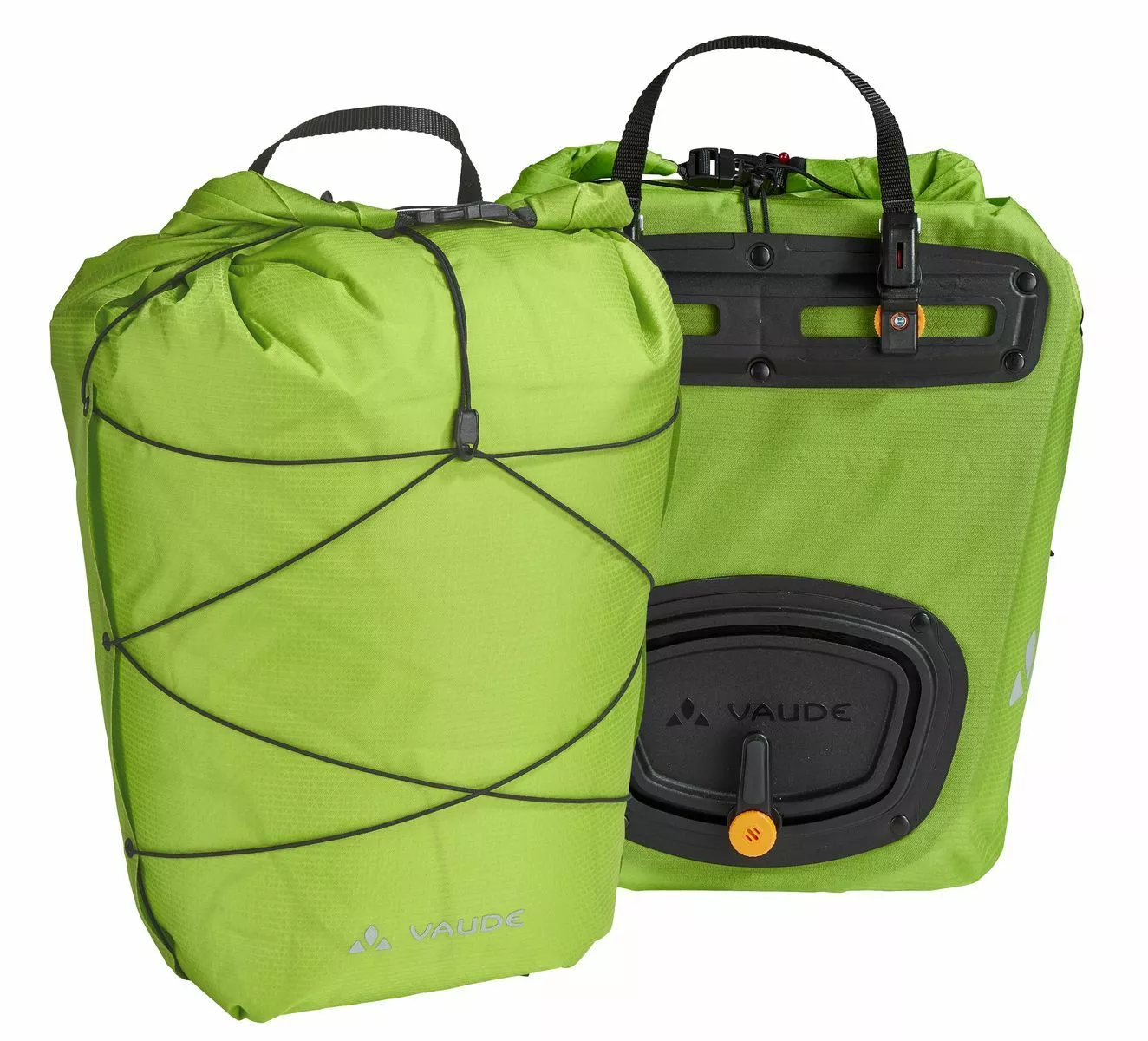 Sacoches de vélo arrière ultra légères Vaude Aqua Back Light. Sacoches étanches de 19 litres chacune (soit 38L la paire) et dotées du système de fixation universel QMR 2.0. Compartiment principal spacieux avec une poche intérieure séparée pour ordonner vos affaires. Sacoches équipées de cordons élastiques à l’avant pour fixer rapidement un fixer rapidement un vêtement ou comprimer les sacoches.