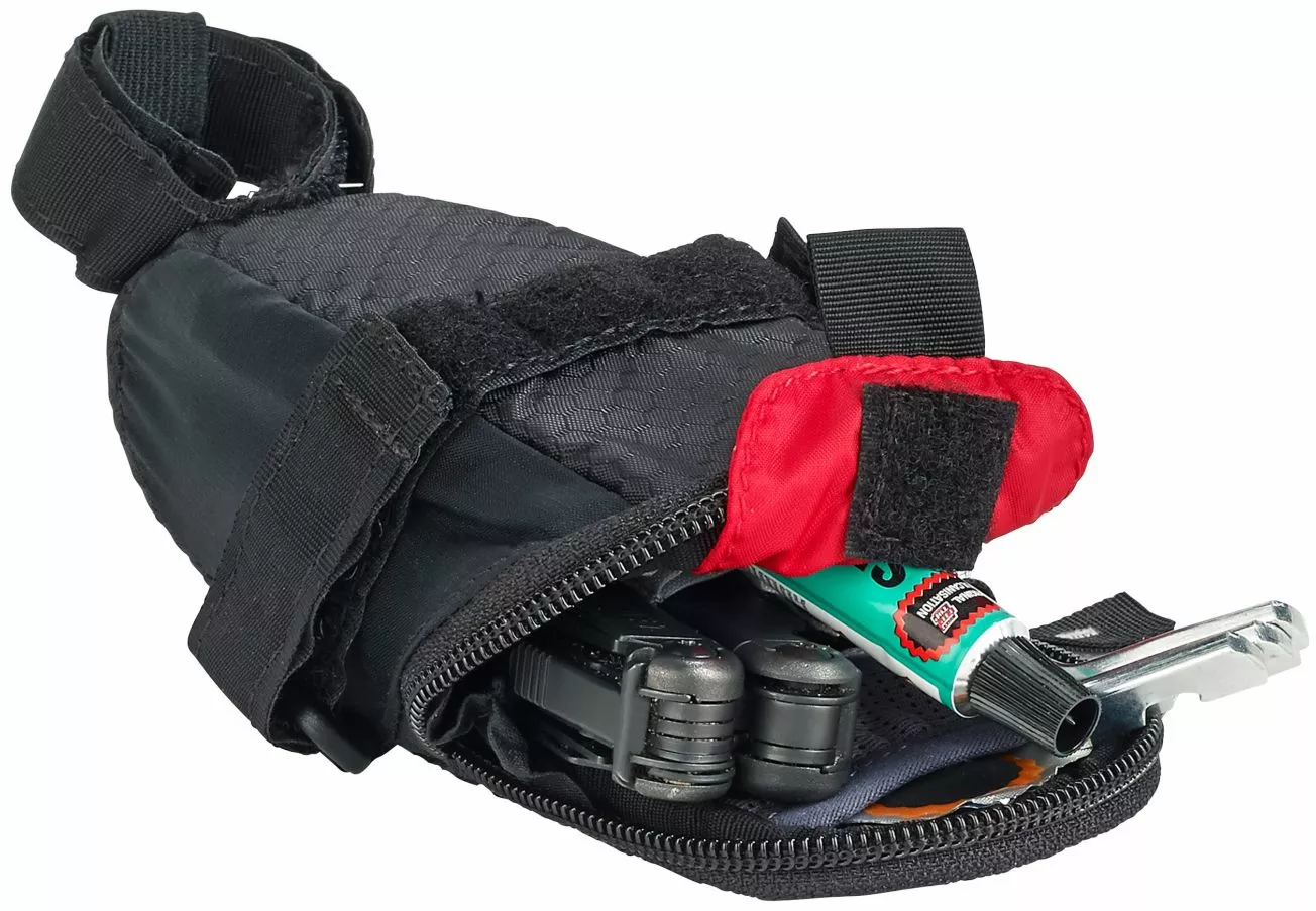Cette sacoche de selle Vaude ultra légère est à fixer par velcro.
