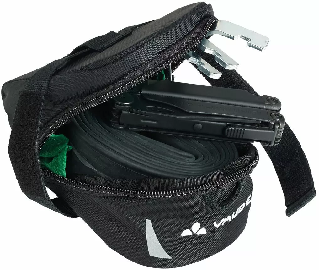 Elle se fixe sous la selle du vélo à l’aide d’un velcro et offre suffisamment de place pour une chambre à air de rechange et les démonte-pneus.