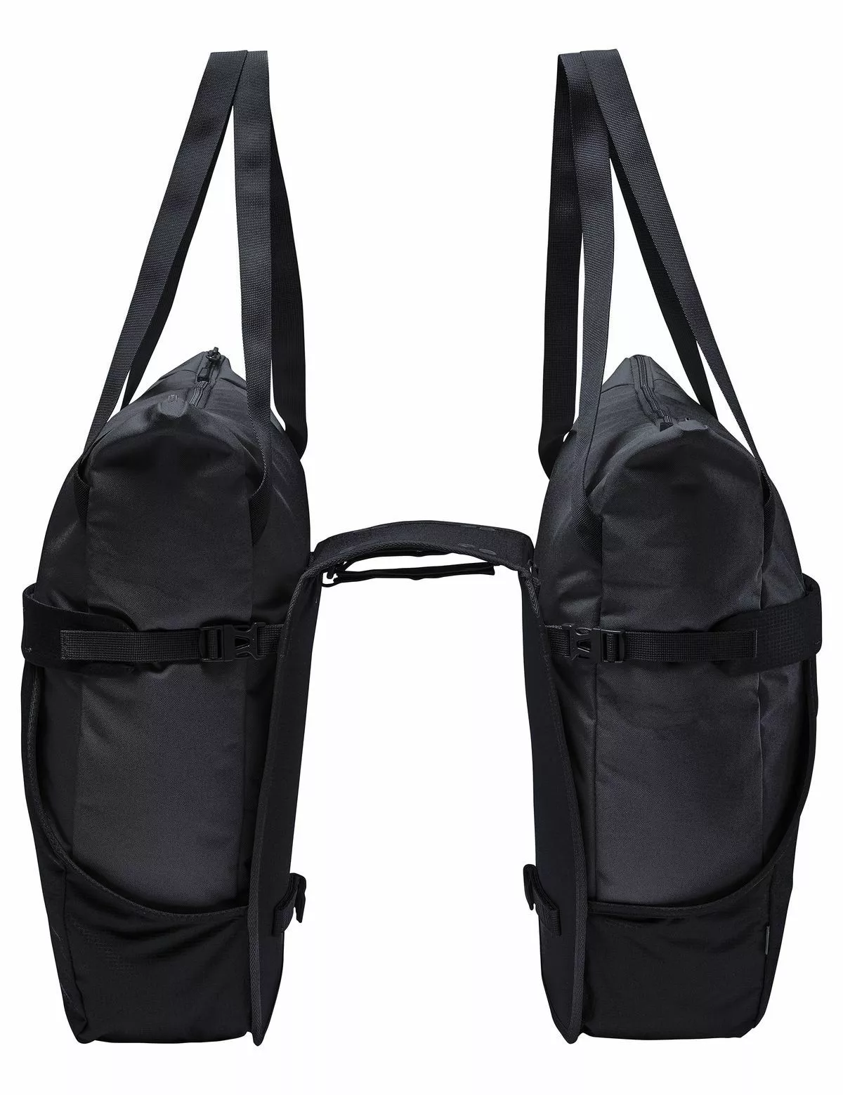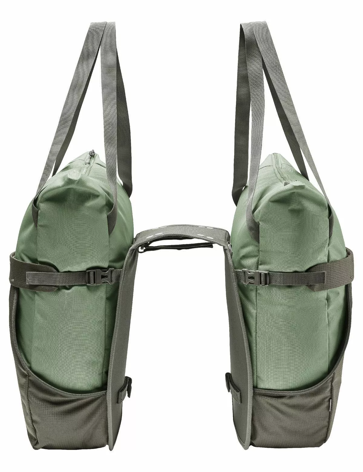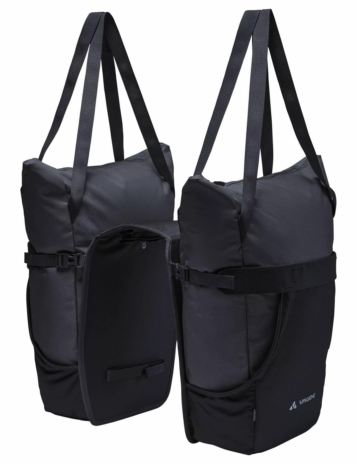 Vaude Twinshopper. A la fois sacoche vélo double et sac cabas. Se fixe sur le porte-bagages à l’aide de sangles ou s’utilise comme sac de course. Avec housse de pluie. Compatible avec différents systèmes de fixation. Sacoches fabriquées dans le respect des normes écologiques.