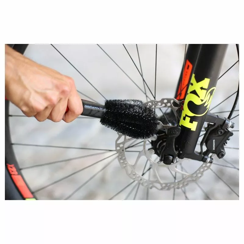 Brosse double tête en fibres de nylon réglable et orientable, idéale pour retirer boue et saletés sur le pédalier, les rayons ou encore les freins à disque.